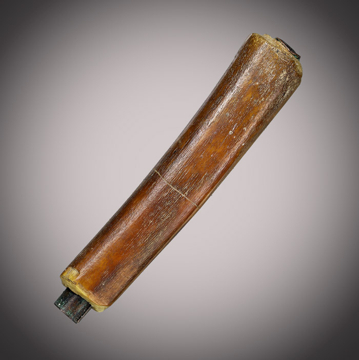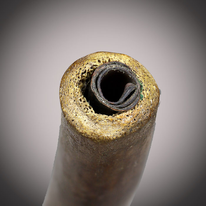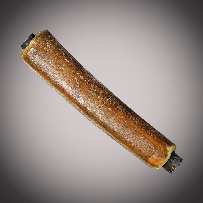 (วัดใจ)ตะกรุดทำจากกระดูก สอดด้านในด้วยตะกรุดทองแดง(ไม่ทราบที่) ขนาดอ้วน 1 cm ยาว 5.3 cm |