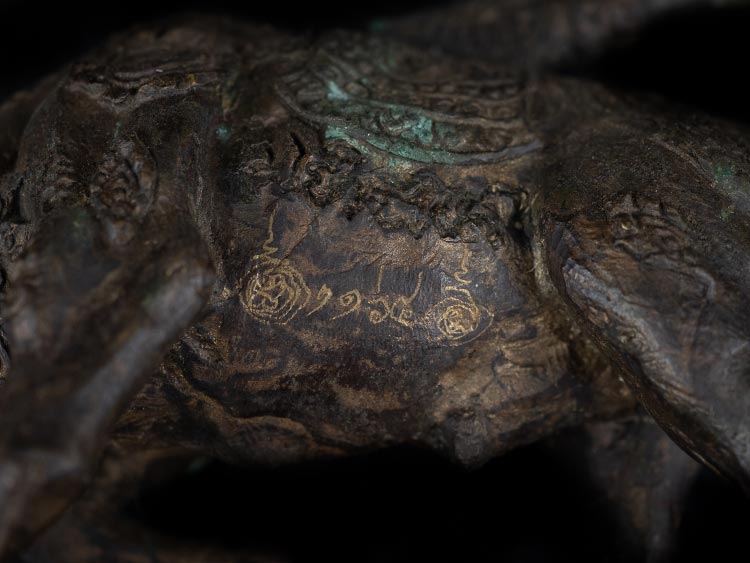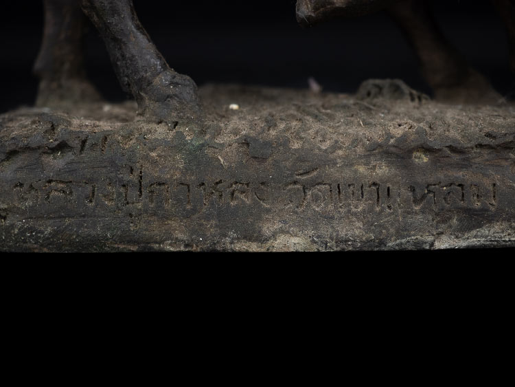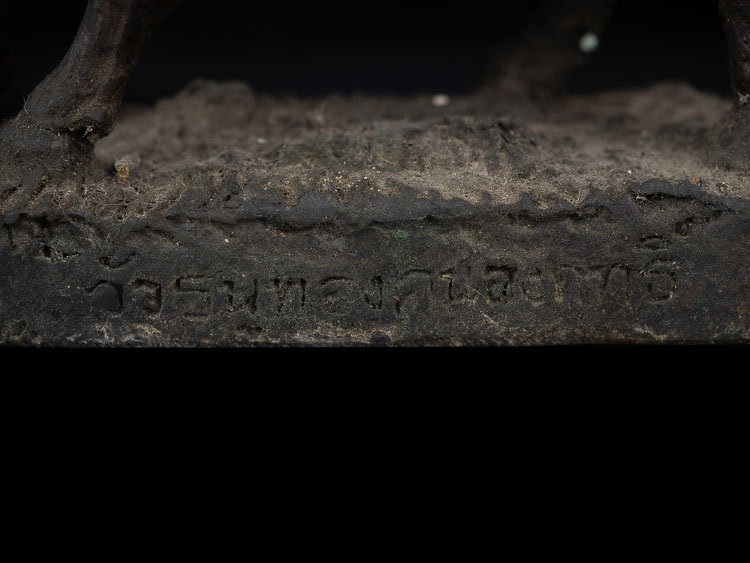 ใต้ฐานอุดปูน ฝังพระวัวธนูเนื้อผงมวลสาร 2 องค์ ครั่งพุทธา 6 เม็ด และตะกรุดเงิน 2 ดอก