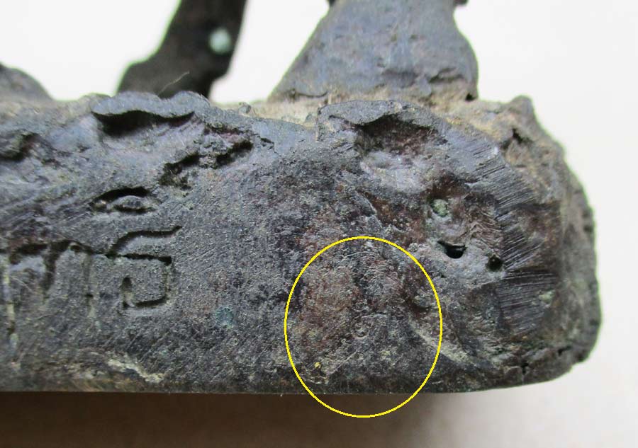 ภาพใต้ฐาน 2.3 นิ้ว X 5 นิ้ว อุดปูน ฝังพระวัวธนูเนื้อผงมวลสาร 2 องค์ ครั่งพุทธา 6 เม็ด และตะกรุดเงิน 2 ดอก