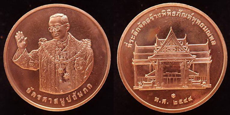 ด้านหน้าเป็นพระบรมฉายาลักษณ์ ร.9 ทรงโบกพระหัตถ์ให้พสกนิกรที่มาเข้าเฝ้าชื่นชมพระบารมีในการออกมหาสมาคม ณ สีหบัญชร พระที่นั่งอนันตสมาคม และด้านหลังเป็นภาพอาคารพิพิธภัณฑ์พุทธมณฑล