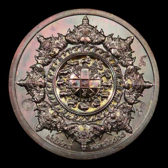 เหรียญบรมครูตาขุนโหร หลักเมือง ๖๘ รุ่น "พ่อให้รวย" นครศรีธรรมราช จัดสร้างโดย หมึก ท่าพระจันทร์ เนื้อทองแดงผิวรุ้งลงยาดำ หมายเลข ๘๗ (เลขสองหลัก) พร้อมกล่องเดิม ปลุกเสก ๔ วาระ พิธีใหญ่แห่งปี เกจิดังทั่วประเทศร่วมปลุกเสก
