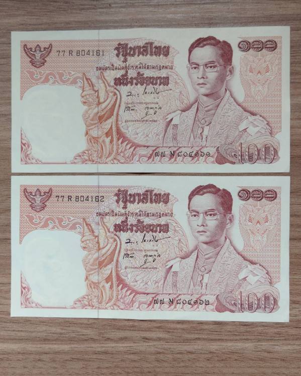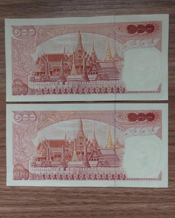 ธนบัตร100บาท แบบที่11 ด้านหลังเรือพระบรมมหาราชวัง สภาพไม่ผ่านใช้งาน UNC อาจมีคราบเหลืองตามขอบบ้างนะครับ ตามอายุ เนื่องจากเริ่มใช้ครั้งแรกตั่งแต่ พ.ศ.2515 เลขเรียง 804161-804162 จำนวน2ฉบับ ธนบัตรรุ่นนี้เป็นรุ่นแรกที่พิมพ์ในประเทศไทย โดยโรงพิมพ์ธนบัตรแห่งประเทศไทย