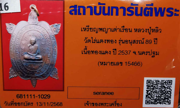เหรียญพญาเต่าเรือน หลวงปู่หลิว วัดไร่แตงทอง รุ่นอนุสรณ์89ปี ค้าขายดี เนื้อทองแดง ห่วงเดิม ปี2537 จ.นครปฐม(หมายเลข15466) + บัตรG-pra สภาพเดิมค่ะ สภาพตามรูปทุกประการค่ะ