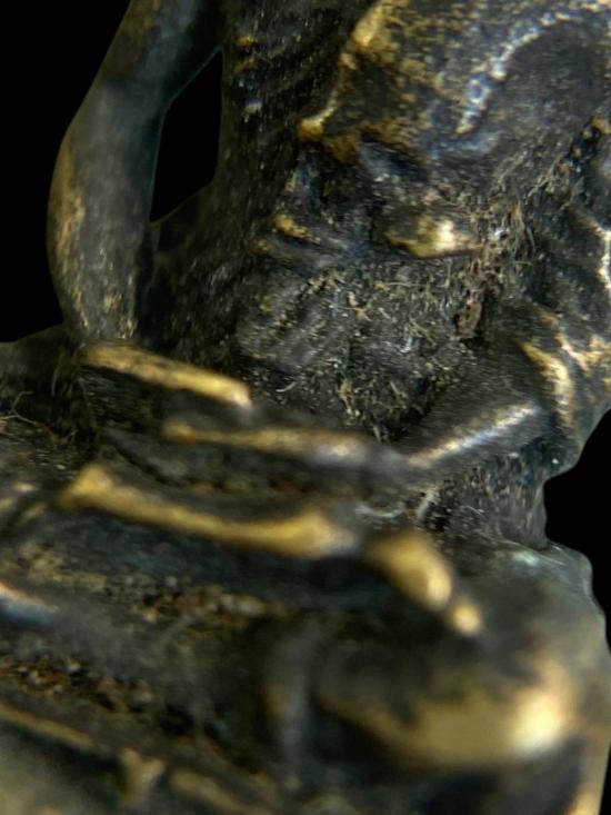 รูปหล่อหลวงพ่อเก่า ไม่ทราบที่ ลักษณะเป็นพระสงฆ์นั่งขัดสมาธิ งานหล่อโบราณ ทรงองค์สมส่วน ใบหน้ามีมิติ แสดงเอกลักษณ์งานเก่า ผิวผ่านการใช้งานยาวนาน มีคราบเก่า คราบสนิม และร่องรอยตามอายุธรรมชาติ เห็นการปิดทองเดิมหลงเหลือบางจุด เนื้อดูแห้งเก่า ไม่ผ่านการแต่งหรือขัดผิว สภาพตามการใช้งานจริง เหมาะสำหรับสายรูปหล่อเก่า สายสะสม หรือบูชาติดตัว