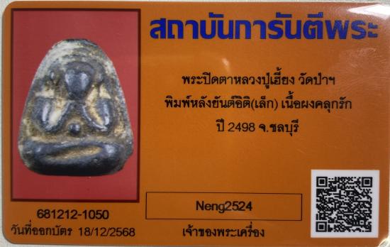 พระปิดตาหลวงปู่เฮี้ยง วัดป่าฯ พิมพ์หลังยันต์อิติ(เล็ก) เนื้อผงคลุกรัก ปี 2498 จ.ชลบุรี + บัตร g pra ครับ