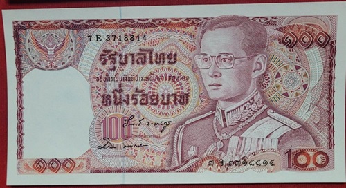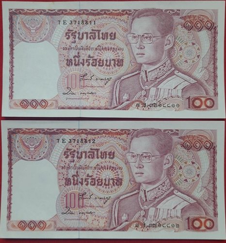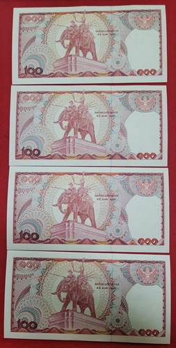 ธนบัตร 100 บาท ในหลวงรัชกาลที่ 9 แบบ 12 รุ่น2 ด้านหลังช้างแดง เลขเรียง จำนวน 4 ฉบับ สภาพ UNC สวย,ใหม่,ไม่ได้ใช้,ไม่มีรอยพับ ลายเซ็นหายากมาก พิมพ์น้อย วีรพงษ์ รามางกูร-ชวลิต ธนะชานันท์ ราคาประเมิน แพงสุดในรุ่นนี้ หมายเลข 7E 3718811 ถึง 7E 3718814
