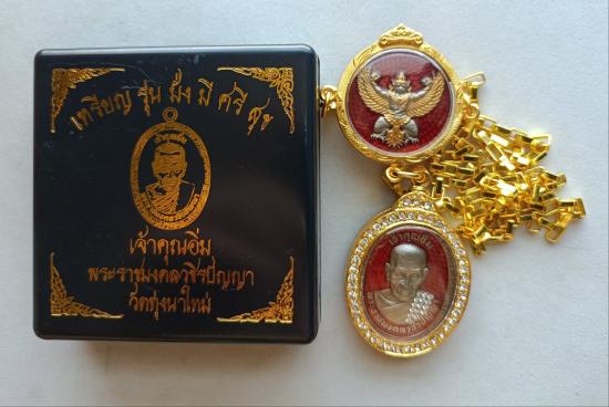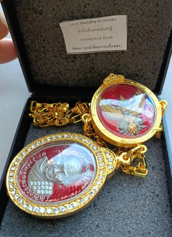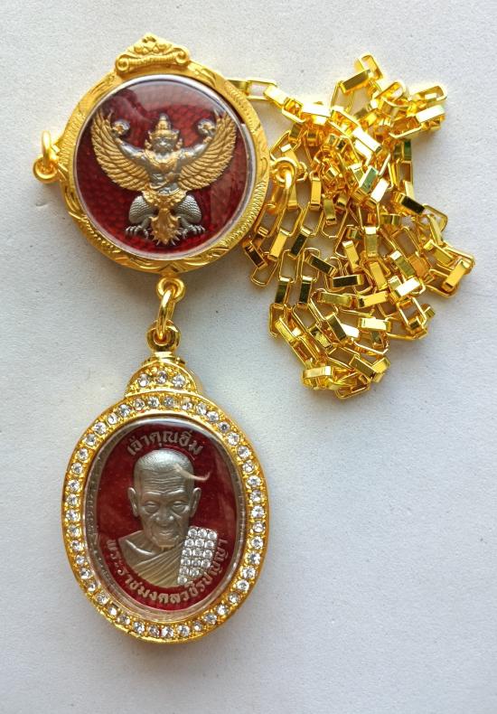 วัดใจเคาะเดียวแดงจ้า เหรียญหลวงปู่อิ่ม วัดทุ่งนาใหม่ รุ่นมั่งมีศรีสุข เนื้ออัลปาก้าซาตินลงยาแดง ฝังเพชรเต็มสังฆฎิ หมายเลข9+เหรียญพญาครุฑหมายเลข88 พร้อมสร้อย เคาะเดียวแดงจ้า |
