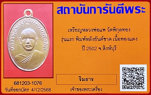เหรียญหลวงพ่อแพ วัดพีกุลทอง รุ่นแรก ปี2502(พิมพ์ยันต์ขาด) มีบัตรรับรองจีพระ เคาะเดียว