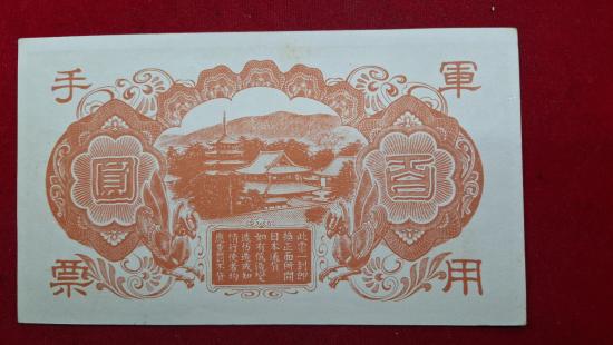 ธนบัตรรุ่นเก่า อายุกว่า 75 ปี จัดพิมพ์ออกใช้สำหรับกองกำลังทหารแห่งสมเด็จพระจักรพรรดิแห่งจักรวรรดิญี่ปุ่น ที่ทำการสู้รบในสงครามมหาเอเชียบูรพาและสงครามโลกครั้งที่ 2 ในส่วนที่ตั้งฐานและยึดครองดินแดนส่วนที่เป็นดินแดนฮ่องกงปัจจุบันและบริเวณเกาะใกล้เคียงที่เคยเป็นอาณานิคมของสหราชอาณาจักร โดยธนบัตรรุ่นนี้จัดพิมพ์ 3 ครั้ง การพิมพ์ครั้งแรกใช้กระดาษและแม่พิมพ์เดียวกับธนบัตร 100 เยน รุ่นปี ค.ศ.1944 แบบปกติที่ใช้ในญี่ปุ่น แต่พิมพ์ตัวอักษรคันจิสีแดง คำว่า ธนบัตรใช้สำหรับหน่วยทหาร แทนข้อความเดิม และฉบับนี้เป็นการพิมพ์ครั้งสุดท้าย(ครั้งที่3) ใช้แม่พิมพ์ใกล้เคียงของเดิมแต่ปรับเปลี่ยนสีให้เป็นโทนสีแดงส้ม และใช้คำว่ามหาจักรวรรดิญี่ปุ่นพิมพ์ลงบนธนบัตร
