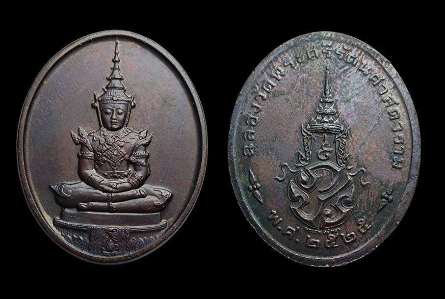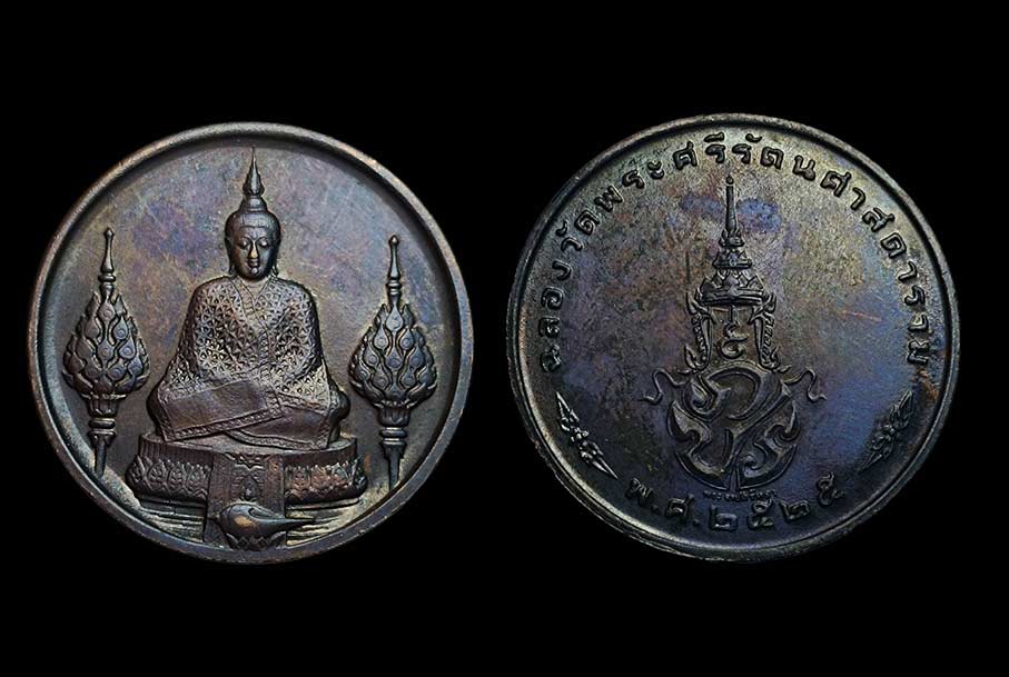 เหรียญชุด พระแก้วมรกต จำนวนรวม 3 เหรียญ หลังพระปรมาภิไธยย่อ ภปร บล๊อก พระราชศรัทธา ฉลองกรุงรัตนโกสินทร์ 200 ปี พ.ศ.2525 ทรงเครื่องฤดูหนาว,ทรงเครื่องฤดูร้อน,ทรงเครื่องฤดูฝน เนื้อทองแดง พร้อมกล่อง