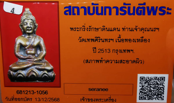 พระกริ่งรักษาดินแดน ท่านเจ้าคุณนรฯ วัดเทพศิรินทร์ฯ เนื้อทองเหลือง กริ่งดัง ปี2513 ตอกโค๊ตดาบไขว้ กรุงเทพฯ + บัตรG-pra |