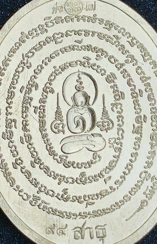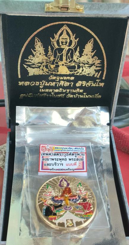 เหรียญแกะสด พุทธศิลป์ "สาธุ" หลวงปู่มหาศิลา สิริจันโท อุปถัมภ์สร้างโบสถ์มหาอุตม์ วัดบ้านโนนเดื่อ เนื้อสัตตะ เทพศาสตราวุธศัตรูพ่าย ลงยาพระพุทธพระสงฆ์และบริวาร หมายเลข ๙๔ พร้อมกล่อง สร้าง๑๐๐เหรียญ