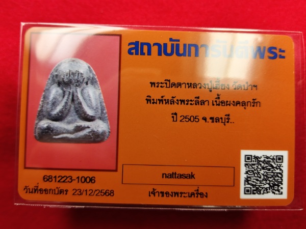 พระปิดตาหลังพระลีลา หลวงปู่เฮี้ยง วัดป่า จ.ชลบุรี เนื้อผงคลุกรัก ปี 2505 พร้อมบัตรรับรอง