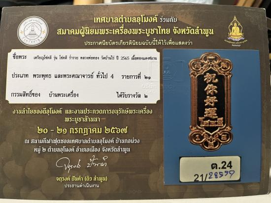 เหรียญโชคดีร่ำรวย หลวงพ่อทอง วัดบ้านไร่ จ.นครราชสีมา ปี2565 เนื้อทองแดงชนวน พร้อมประกาศนียบัตรรางวัลที่2 |