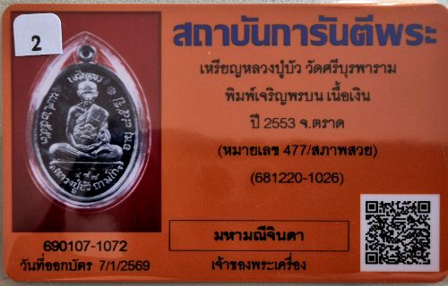"สภาพสวย"เหรียญเจริญพรบน หลวงปู่บัว เนื้อเงิน ปี 2553 หมายเลข 477 ผิวกระจก สวยแชมป์ พร้อมบัตรรับรองสภาพสวยครับ