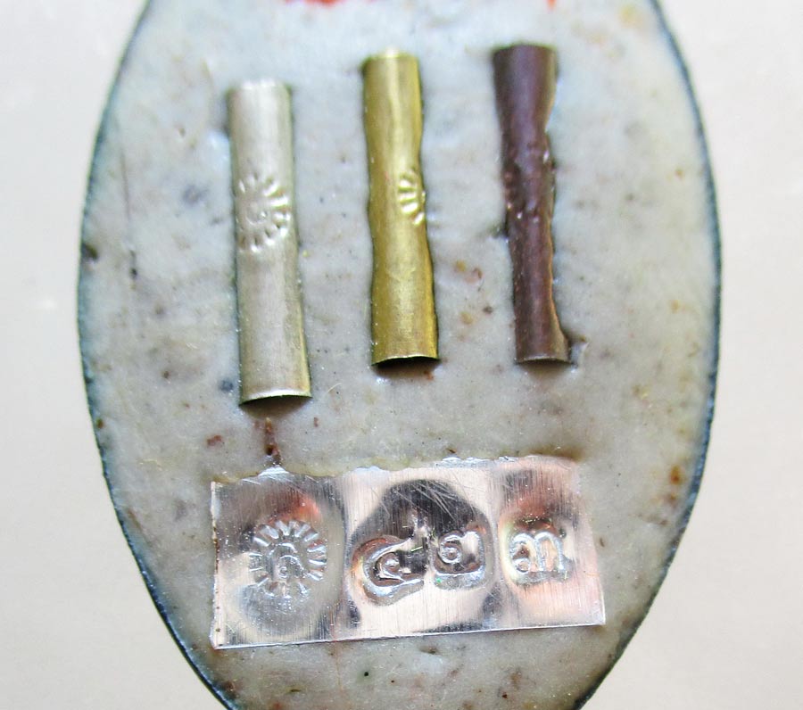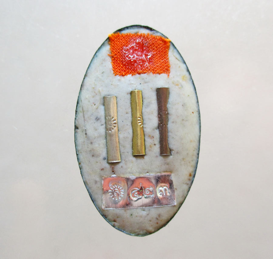 ด้านหลังอุดผงมวลสาร ติดเศษจีวร ฝังตะกรุด 3 ดอก