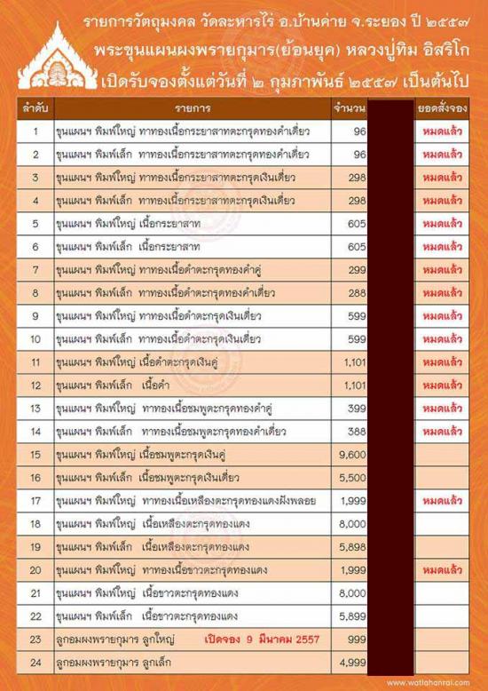 ปีและรุ่น:พ.ศ. 2557 (รุ่นที่ระลึกเททองหล่อหัวใจ หลวงปู่ทิม อิสริโก)