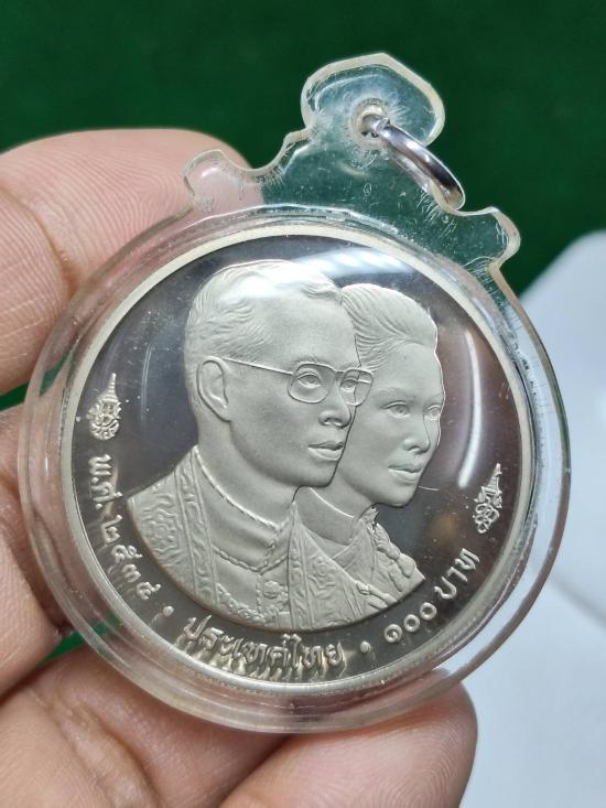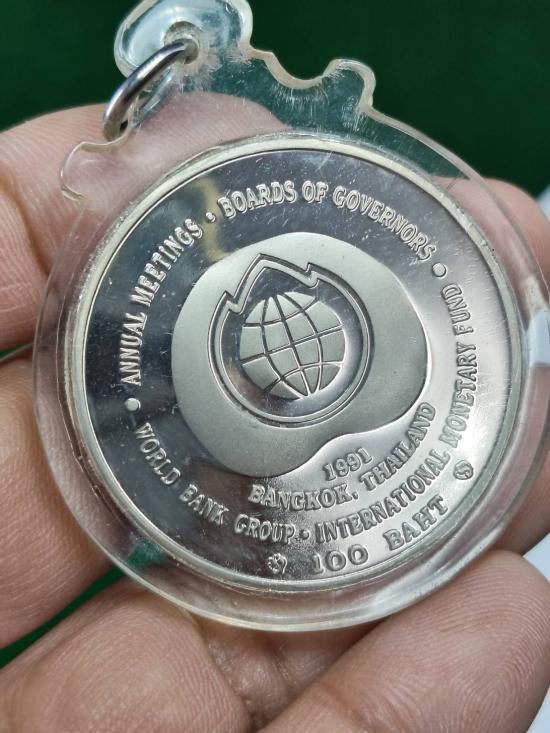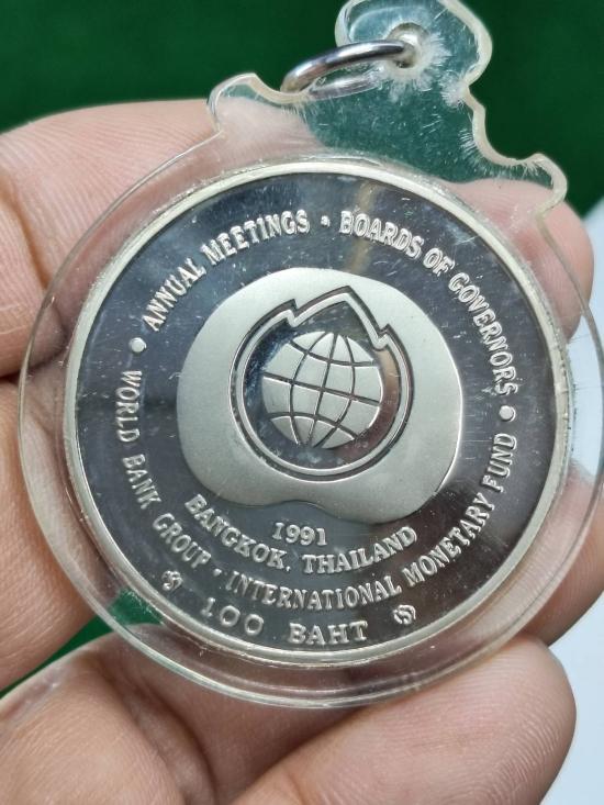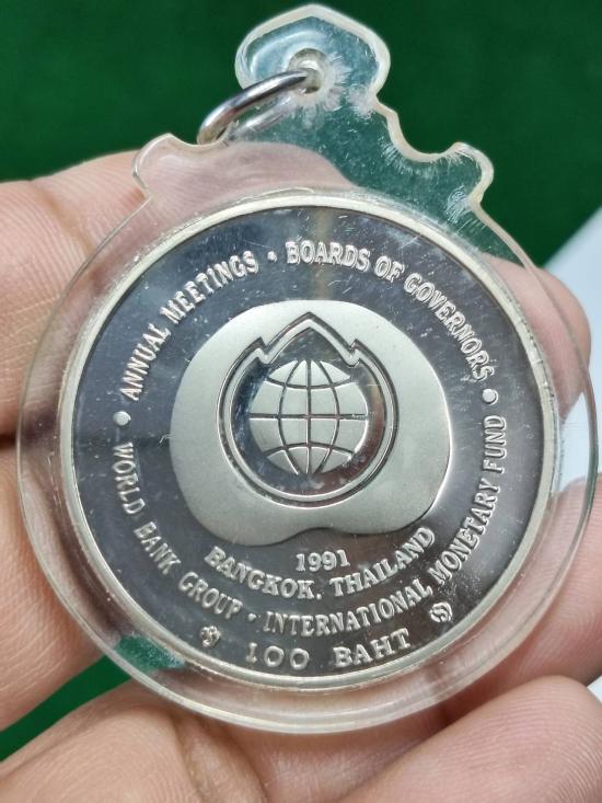 เหรียญกษาปณ์ในหลวงรัชกาลที่ 9 ที่ระลึกประชุมผู้ว่าการธนาคารโลก พ.ศ.2534 ชนิดราคา 100 บาทเนือนิกเกิ้ลขัดเงา ครับ
