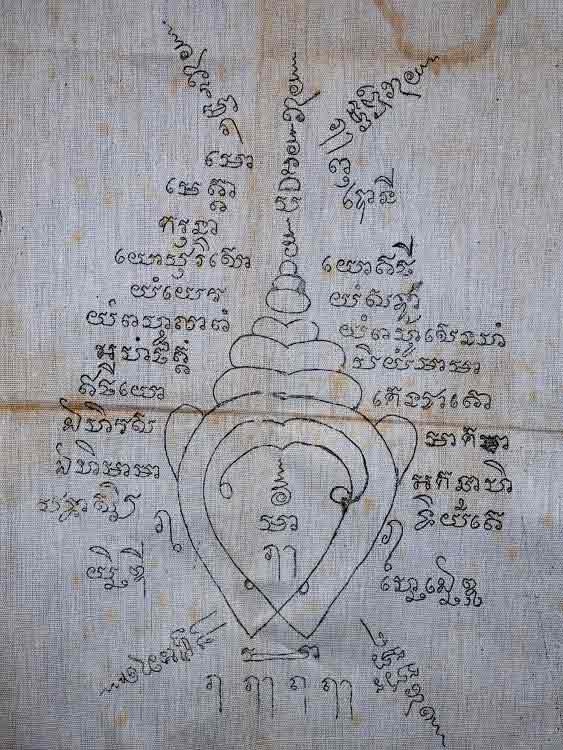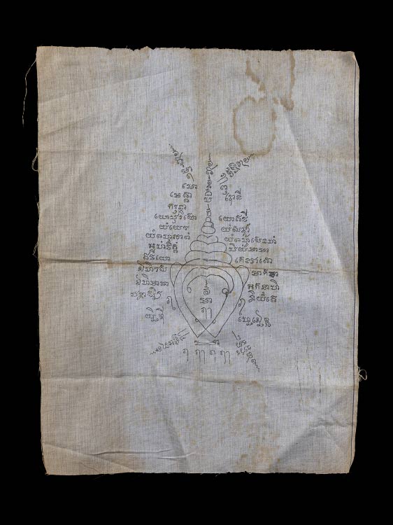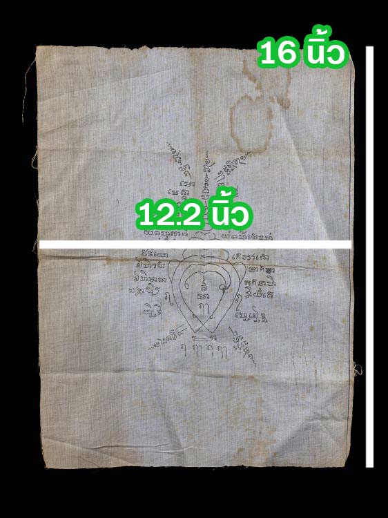 ผ้ายันยันต์พัดโบก ผ้าขาวห่อศพ หลวงพ่อเริ่ม วัดจุกกะเฌอ ชลบุรี ยุคต้นๆ สภาพสวยๆ มีคราบเปื้อนตามรูปครับ ขนาด 16x12 นิ้ว |