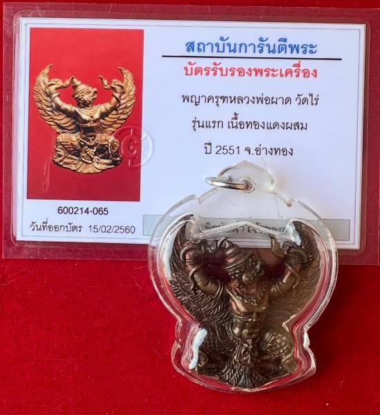 ชื่อพระเครื่อง เคาะแรกแดง พญาครุฑหลวงพ่อผาด วัดไร่ รุ่นแรก เนื้อทองแดงผสม ปี 2551 จังหวัดอ่างทอง