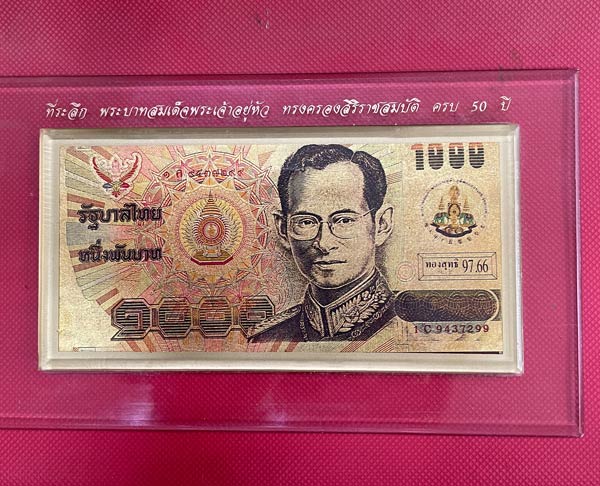 ธนบัตร 1000 บาท ที่ระลึก พระบาทสมเด็จพระเจ้าอยู่หัว ทรงครองสิริราชสมบัติ ครบ 50 ปี ทองสุทธิ 97.66 เลข 1 C 9437299 9 หน้า 9 หลัง สวยๆครับ