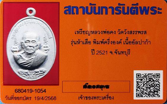 เหรียญหลวงพ่อคง วัดวังสรรพรส รุ่นห้าเสือ พิมพ์ครึ่งองค์ เนื้ออัลปาก้า ปี 2521 จ.จันทบุรี พร้อมบัตรG...