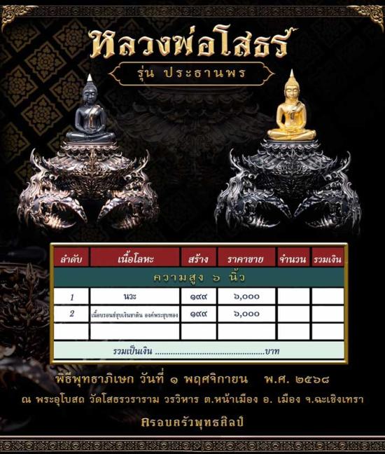 พระบูชา หลวงพ่อโสธร หน้าตัก 6 นิ้ว เนื้อ นวะ รุ่นประธานพร พุทธาภิเษก 1 พฤศจิกายน 2568 ที่ผ่านมา