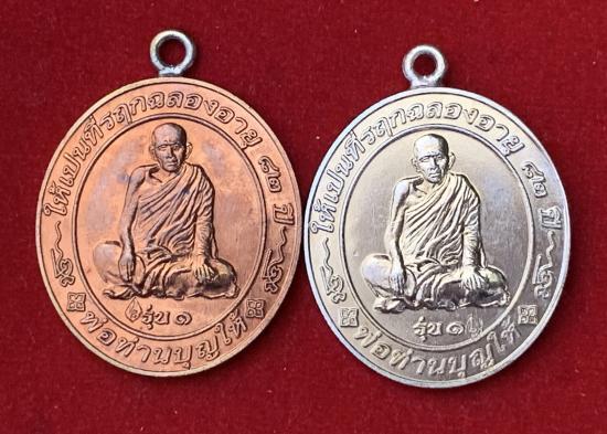 เหรียญห่วงเชื่อมรุ่นแรก ที่รฤกฉลองอายุ 82 ปี พ่อท่านบุญให้ วัดพรหมมัญพงศาราม จ.นครศรีธรรมราช เนื้ออัลปาก้า +ทองแดง หมายเลข ๔๔