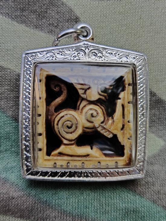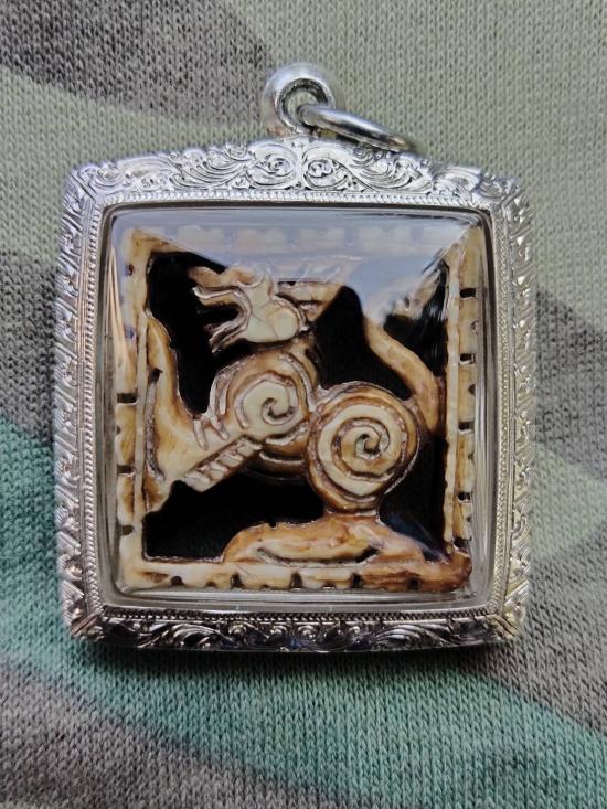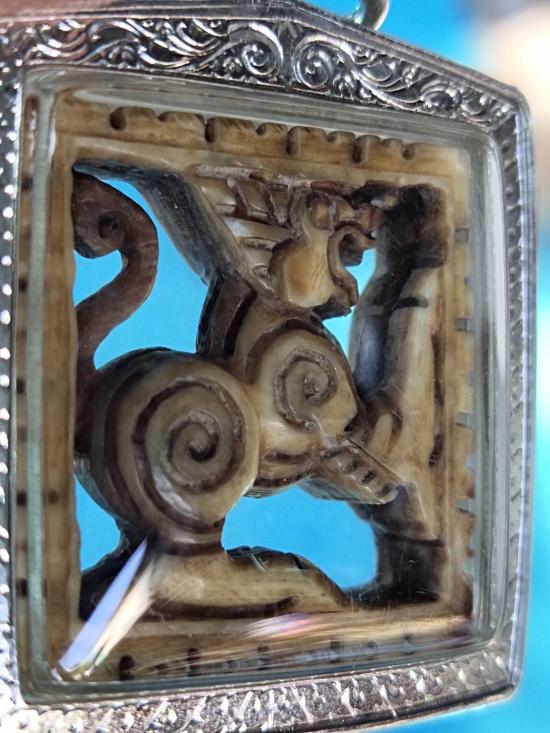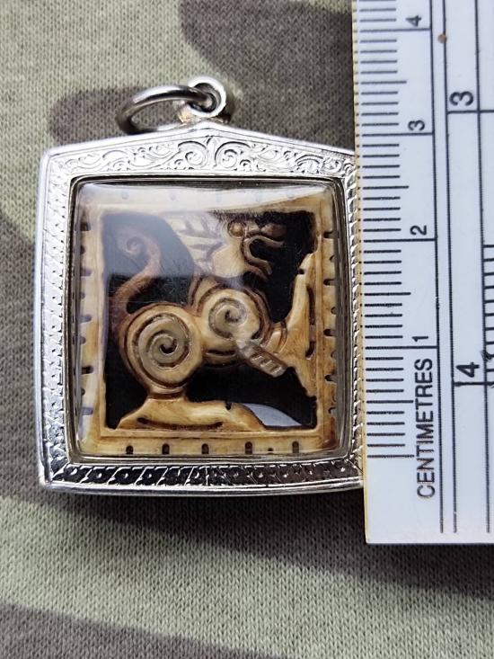 ชื่อพระเครื่อง สิงห์สองขวัญงาแกะในกรอบกระจก ขนาด 2.5 cm.ไม่ทราบที่