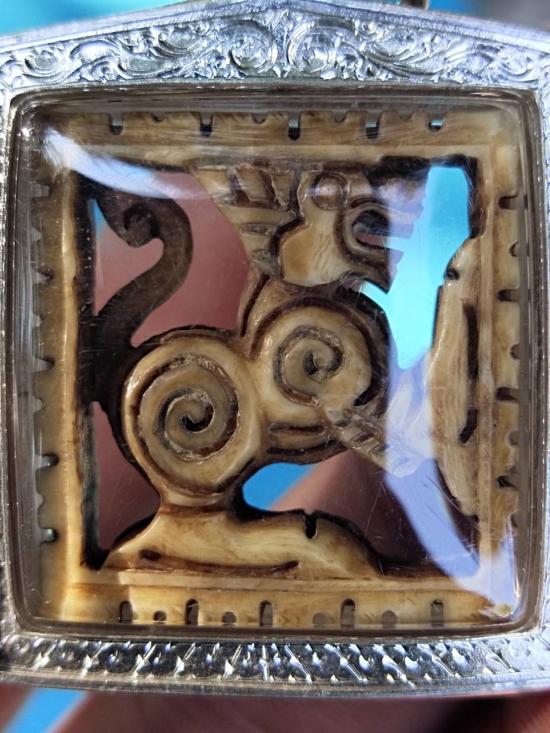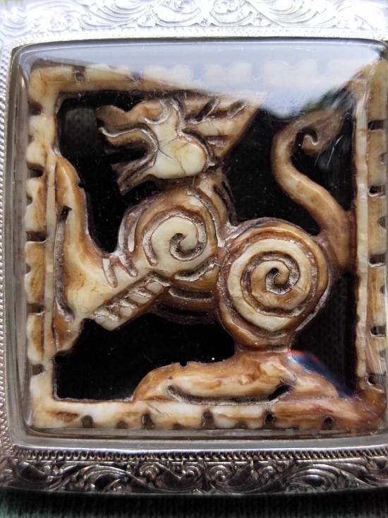 สิงห์สองขวัญงาแกะในกรอบกระจก ขนาด 2.5 cm.ไม่ทราบที่