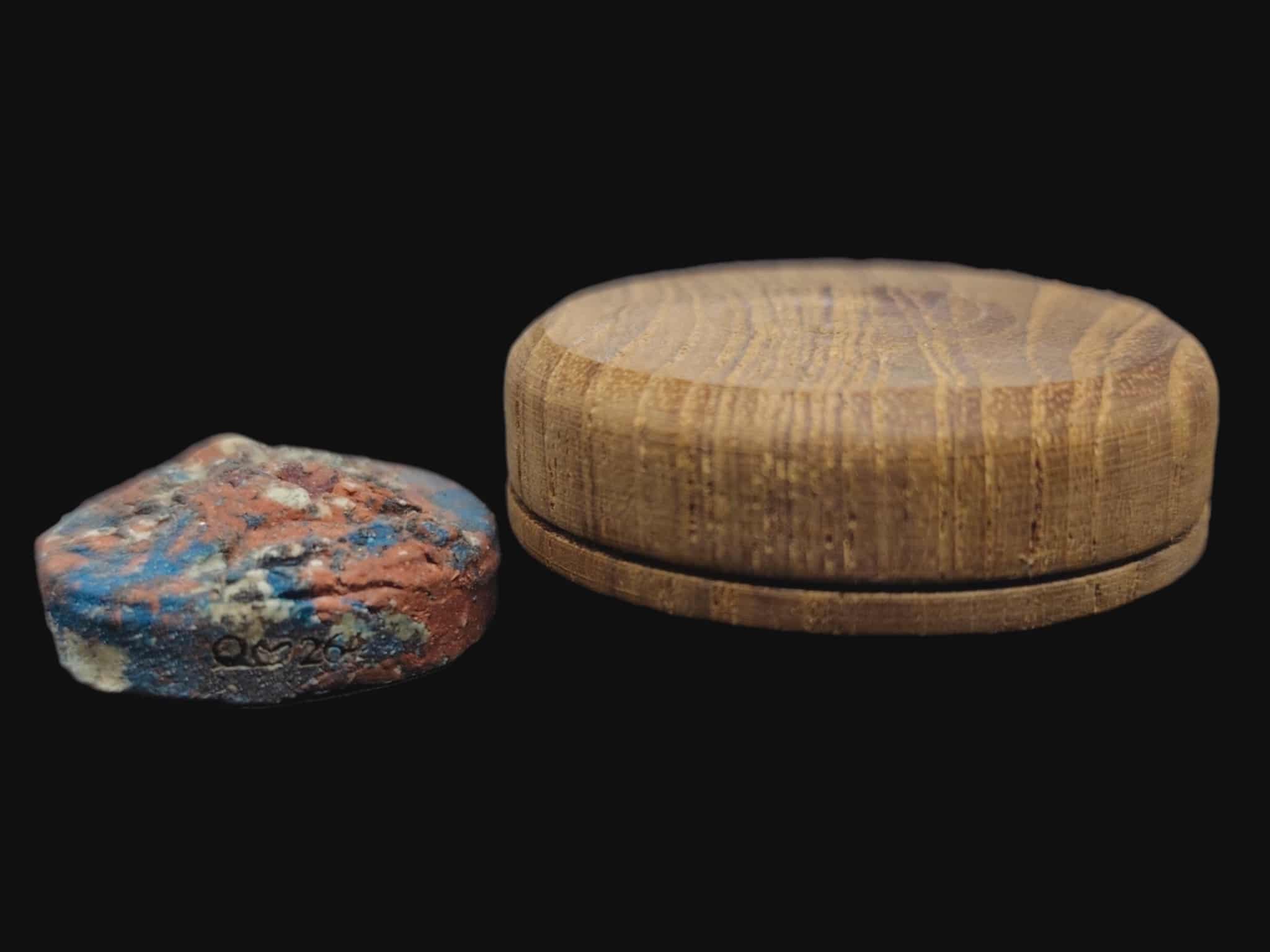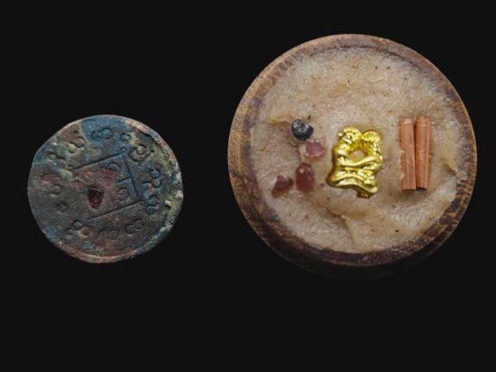 พญายูงคำ รุ่นแรก เนื้อก้นครก และ ตลับไม้สีผึ้งเนื้อหอม รังผึ้งร้าง ขวางเดือนขวางตะวัน รุ่นแรก ฝังอิ่น ตะกรุด ในเมตตาบารมี เจ้าปู่จั่นต่า กาวิสาละ พญานกยูง ขนาดเท่าเหรียญสิบบาท