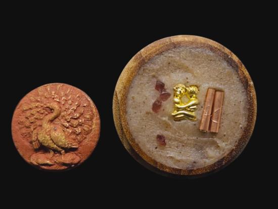 พญายูงคำ รุ่นแรก เนื้อผงชาดปัดทอง และ ตลับไม้สีผึ้งเนื้อหอม รังผึ้งร้าง ขวางเดือนขวางตะวัน รุ่นแรก ฝังอิ่น ตะกรุด ในเมตตาบารมี เจ้าปู่จั่นต่า กาวิสาละ พญานกยูง ขนาดเท่าเหรียญสิบบาท