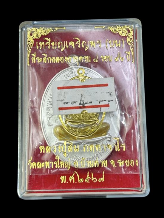 ชื่อพระเครื่อง เคาะแรกแดงครับ เหรียญเจริญพรบน เนื้อเงินลงยา จีวรเหลือง หลวงพ่อสิน รุ่นฉลองอายุครบ 8 รอบ ปี 2567 เลข 143 สวยกริ๊บ