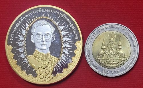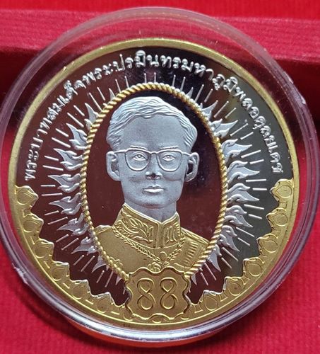 เหรียญที่ระลึก เฉลิมพระเกียรติ พระบาทสมเด็จพระเจ้าอยู่หัว ภูมิพลอดุลยเดช ทรงเจริญพระชนมพรรษา 88 พรรษา เหรียญเงินแท้ 99.99 % ขัดเงาและเคลือบทองคำแท้บางส่วน