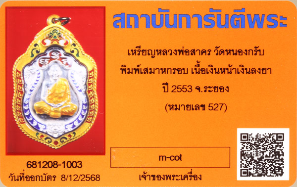 เหรียญเสมา6รอบ หลวงพ่อสาคร วัดหนองกรับ เนื้อเงินหน้าเงิน(ลงยา3สี) ปี2553 หมายเลข527 พิมพ์คมชัด ผิวสวยงดงาม สภาพสวยเดิมครับ