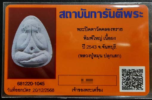 พระปิดตาวัดคลองทราย หลวงปู่หมุน พิมพ์ใหญ่ เนื้อผง ปี2543 พร้อมบัตรรับรองครับ |