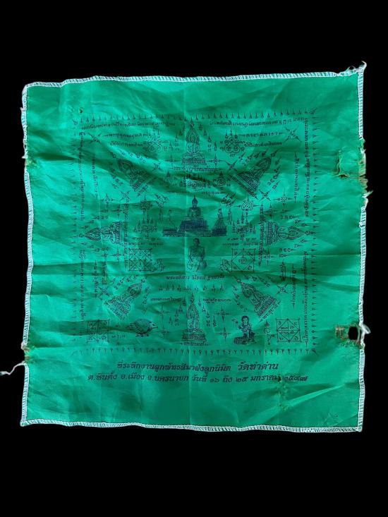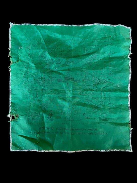 ผ้ายันต์เก่า วัดท่าด่าน ต.หินตั้ง อ.เมือง จ.นครนายก จัดสร้างปี 2547 ลักษณะเป็นผ้าสีเขียว พิมพ์ยันต์และอักขระเต็มผืน งานพิมพ์หมึกเดิมตามยุค ขอบผ้าเย็บริม สภาพตามการใช้งานจริง มีรอยยับและตำหนิจากอายุการเก็บ ถือเป็นของสายเครื่องรางผ้ายันต์ วัดดังนครนายก เหมาะสำหรับเก็บสะสม แขวนบูชา หรือพับพกติดตัวตามความเชื่อ