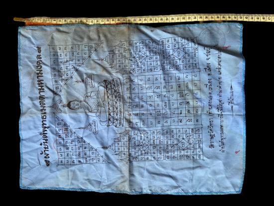 ผ้ายันต์พุทธเมตตามหามงคล วัดราษฎร์ศรัทธา (ท้ายดอน) ต.เหมือง อ.เมือง จ.ชลบุรี ลักษณะเป็นผ้าสีฟ้า พิมพ์ยันต์และตารางอักขระเต็มผืน มีรูปพระพุทธประทับนั่งกลางผืน รายล้อมด้วยตารางเลขยันต์และลายยันต์สายเมตตามหามงคล งานพิมพ์หมึกเดิม ขอบผ้าเย็บริม สภาพตามการใช้งานจริง มีรอยยับ คราบอายุ และรอยเปื้อนเล็กน้อยจากการเก็บ เหมาะสำหรับสายผ้ายันต์เมตตามหานิยม แขวนบูชา พับพก หรือเก็บสะสมเป็นของเก่า