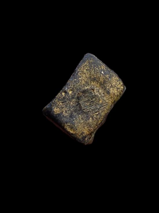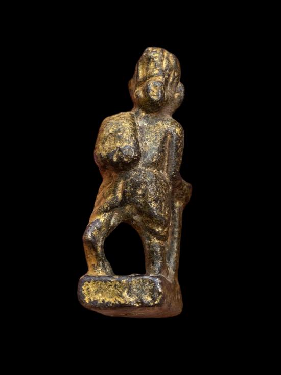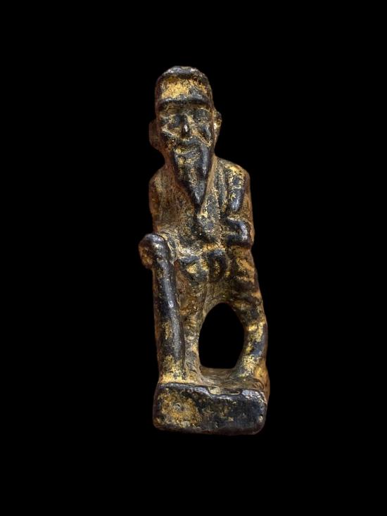 เครื่องรางเก่า รูปฤๅษี เนื้อโลหะหล่อโบราณ ทรงยืนถือไม้เท้า ลักษณะงานหล่อเก่าทำมือ รายละเอียดใบหน้า เครา และสัดส่วนยังพอมองเห็นได้ มีคราบทองเดิมติดกระจายทั่วองค์ ผิวแห้งจัดตามอายุ มีรอยสึก รอยใช้งาน และคราบเก่าธรรมชาติ ไม่ผ่านการล้างหรือแต่งผิว ฐานเป็นแท่นตัน สภาพตามการใช้งานจริง เหมาะสำหรับสายเครื่องรางโบราณ สายฤๅษี หรือผู้ที่ชอบงานเก่าแท้เชิงศิลป์และพุทธศิลป์พื้นบ้าน