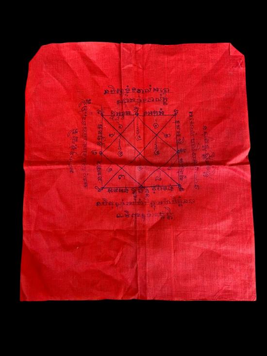 ผ้ายันต์เก่า พิมพ์ลายยันต์และอักขระเต็มผืน งานพิมพ์หมึกเดิม สภาพผ่านการใช้งานจริง มีรอยยับ รอยพับ และคราบเก่าจากอายุการใช้งาน ไม่ผ่านการแต่งหรือซ่อมแซม เหมาะสำหรับแขวนบูชา พับพก หรือเก็บสะสมในสายผ้ายันต์และเครื่องรางพื้นบ้าน