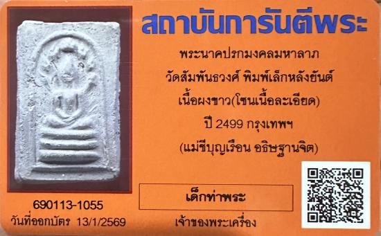 พระนาคปรกมงคลมหาลาภ พิมพ์เล็ก ขนาด 3.3*2.2 ซม. เนื้อผงขาว (โซนเนื้อละเอียด) หลังยันต์กลับ ปี 2499 วัดสัมพันธ์วงศ์ จ.กรุงเทพฯ (แม่ชีบุญเรือนอธิษฐานจิต)