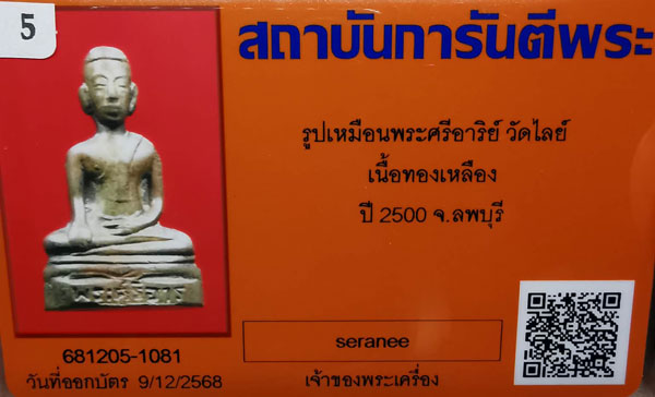 พระกริ่งรูปเหมือนพระศรีอาริย์ วัดไลย์ รุ่นแรก เนื้อทองเหลือง ปี2500 จ.ลพบุรี + บัตรG-pra สภาพเดิมค่ะ |