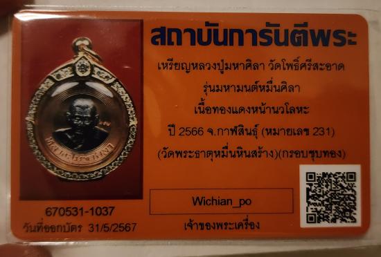 เหรียญหลวงปู่มหาศิลา วัดโพธิ์ศรีสะอาด รุ่นมหามนต์หมื่นศิลา เนื้อทองแดงหน้านวโลหะ ปี 2566 จ.กาฬสินธุ์ หมายเลข 231 (วัดพระธาตุหมื่นหินสร้าง)(พร้อมกรอบทองอิตาลี)+บัตร G-pra
