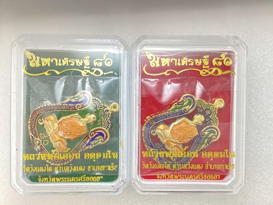 เคาะเดียวแดง 200 ( 2 เหรียญ) เหรียญรูปเหมือน หลังหนุมาน8กรขี่สิงห์ รุ่น มหาเศรษฐี๘๐ หลวงพ่อเอื้อน วัดวังแดงใต้ จ.พระนครศรีอยุธยา เนื้อกะไหล่ทองลงยาสีแดง ,สีเขียว กล่องเดิม