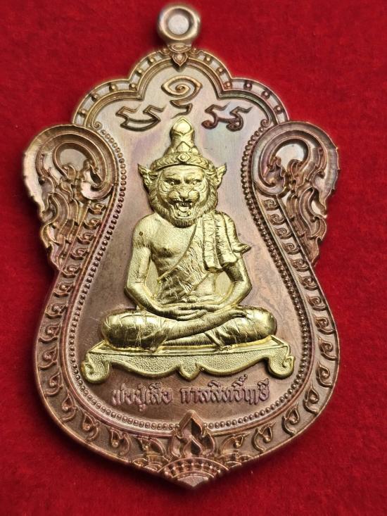 เหรียญพิมพ์เสมา พ่อปู่เสือ กาลสิทธิ์ รุ่นแรกท่าสมอ หลวงพ่อเกาะ อาภากโร วัดท่าสมอ จ.ชัยนาท(ศิษย์สายตรงหลวงพ่อกวย วัดโฆษิตาราม) เนื้อทองแดงผิวรุ้งหน้ากากทองระฆัง หมายเลข๕๔ ผลรวมได้๙ พร้อมกล่อง