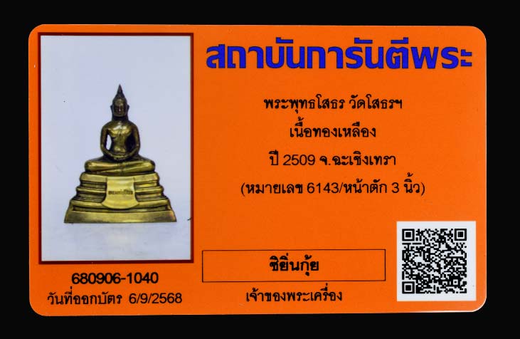 พระบูชาหลวงพ่อโสธร หน้าตัก 3 นิ้ว ปี2509 (ตรงปี) หมายเลข 6143 พร้อมบัตรรับรอง G-Pra
