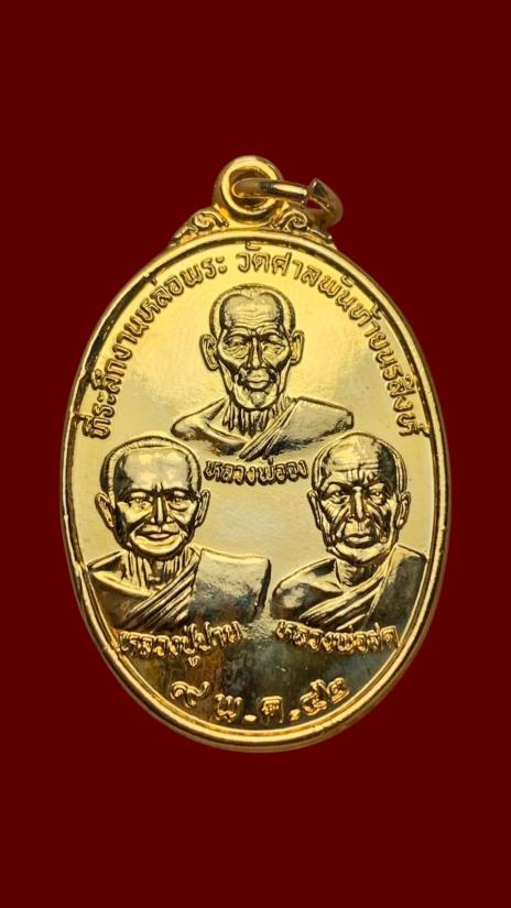 เหรียญ 3อาจารย์ หลวงพ่อจง หลวงปู่ปาน หลวงพ่อสด หลังหลวงพ่อฤาษีลิงดำ กะไหล่ทอง วัดศาลพันท้ายนรสิงห์ ปี42
