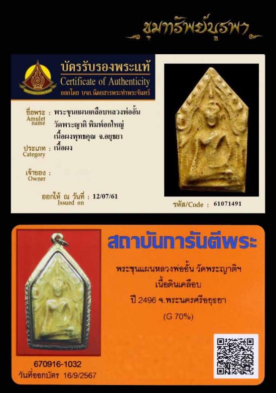 พระขุนแผนหลวงพ่ออั้น วัดพระญาติฯ 2496 พร้อมบัตรรับรอง 2 บัตร พระไม่มีกรอบทองแล้วนะครับ