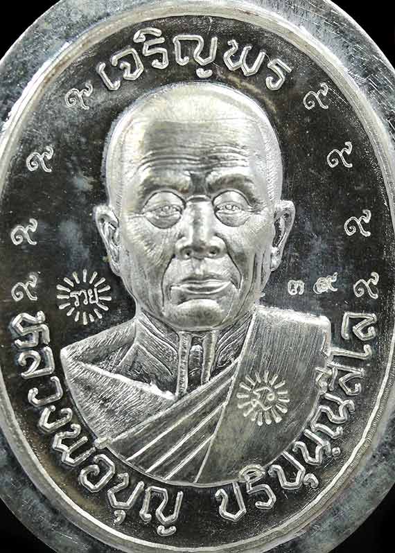เหรียญ รุ่นเจริญพรบน หลวงปู่บุญ ปริปุนฺณสีโล สวนนิพพาน ( วัดปอแดง ) จ.นครราชสีมา เมตตามหานิยม พ.ศ.2558 เนื้อเงินบริสุทธิ์ไม่ตัดปีก ตอก 11 โค๊ต ตอกเลข สภาพสวยสมบูรณ์