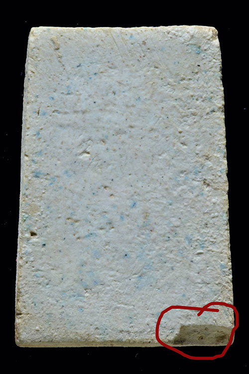 ชื่อพระเครื่อง วัดใจ 490.พระเนื้อง ผิวหิ้ง มีอายุพอสมควรครับ มีบิ่นมุมล่างตรงที่วงไว้ตามรูปครับ ขนาดองค์พระประมาณพระสมเด็จทั่วๆไป